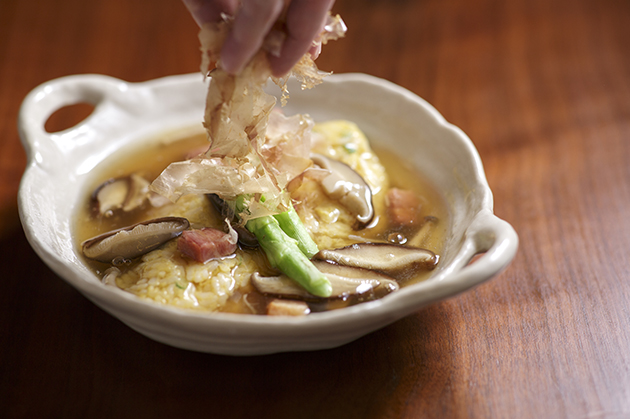 毎夜舌の肥えた大人たちが通う「茶ばしら」。日本料理店を渡り研鑽した店主の橋本伸治さんが、自身の目で選んだ食材を、手間をかけながらもシンプルに調理する。魚介は、天然にこだわる。春から初夏にかけては、キンメやイサキ、太刀魚、アマダイなどを熟成させ、ねっとりとした甘みと旨みを凝縮させる。野菜は、産地、生産者にこだわる。高い香りと、歯ごたえの良い梅ヶ島の原木しいたけ、極小の若芽だけを選び抜いた秋田のジュンサイ、長野の極太アスパラなど、厳選した全国の旬の食材を使い、素材本来の旨みが味わえる料理に仕上げる。橋本さんの心が行き届いた素朴な一皿は、繊細な日本酒や焼酎と相性がいい。時間を忘れて、つい盃を重ねてしまうが、夜が更けても締めの一品は忘れずに。それは、オープン以来人気の和風オムライス。卵とご飯、たっぷりの薬味野菜を合わせて、ふんわりと焼き上げる。そこに季節の野菜を加えたあんを注いでいく。仕上げに、香りのいい花ガツオをまぶす。ほろ酔いの体に、心地よい和の味が染みていく。このオムライスをはじめ、天丼やオードブル盛り合わせ(2人前3,000円~)などは、テイクアウトも可能。電話で注文すれば、1品からでも対応してくれる。